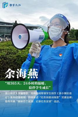 在“抗疫”前线,老师们是澎湃“前浪”,冲锋在前守住校园,发挥专长扛起责任。“坚持用365天,24小时的温暖,陪伴学生成长。”文化创意与传播学院辅导员余海燕入选教育之江《闪闪发光的浙江青年》第二季,她在疫情期间带领学生创作《浙小狮抗疫记》系列动漫视频,持续推进“红色创意训练营”党建品牌,指导开展“摄制百个视频,记录红色足迹”活动。