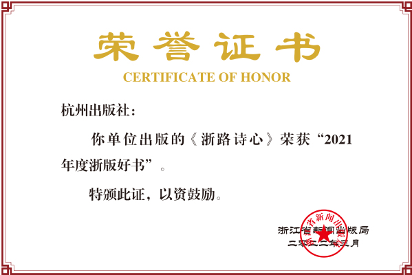 今年3月《浙路诗心》获评“2021年度浙版好书”。“浙江好书榜”由浙江省委宣传部主办,是业内推荐浙版优质图书权威性高、覆盖面广,深受读者喜爱的荐书风向标。
