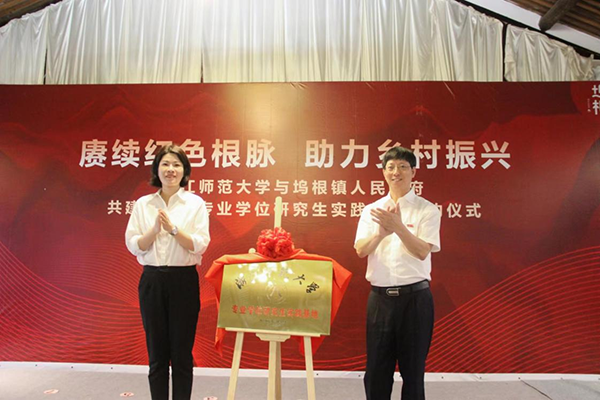 浙师大副校长钟依均、坞根镇党委书记张颖共同为共建专业学位硕士研究生实践教学基地揭牌。