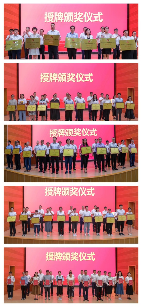 现场,浙师大党委领导班子成员为校首批党建工作“标杆院系”“样板支部”授牌,为校第九届微型党课大赛获奖代表颁奖。同时,还公布了校第二批党建工作“标杆院系”培育创建单位,第二批党建工作“样板支部”培育创建单位名单。