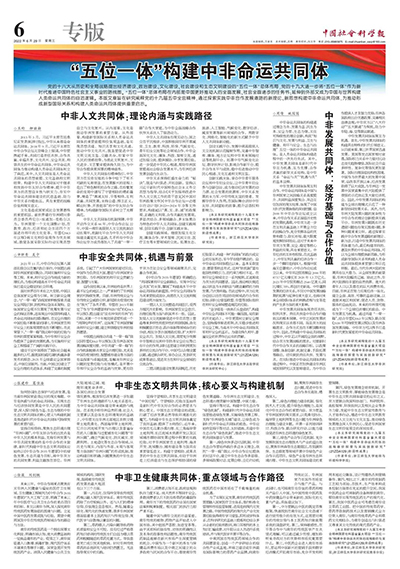 中非命运共同体的构建通过理念为先、发展为基、民生为本、安全为要、生态为继,关注可持续性的理论创新,构筑“知识与文化、发展与利益、卫生与健康、和平与安全、生态与治理”五位一体的中非命运共同体,是人类命运共同体构建进程中的一次先行先试。其中,中非发展共同体是新时代中非互为机遇、互为支撑、合作共赢的新型关系结构,是中非关系“命运与共”“机遇与共”的基本诠释。