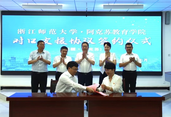 7月8日,浙江师范大学与阿克苏教育学院举行对口支援协议签约仪式,阿克苏地委副书记、教育工委书记,浙江省援疆指挥部党委书记、指挥长朱林森,浙江师范大学党委副书记、校长郑孟状出席签约仪式并分别致辞,阿克苏地区行署副专员、地委教育工委副书记王新春主持仪式。