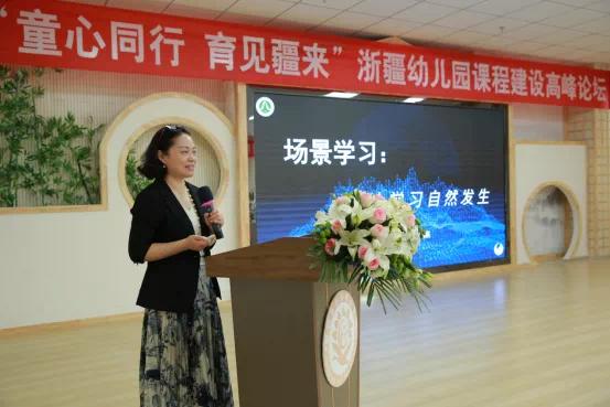 在以“探索适宜、有效课程”为主题的“童心同行 育见疆来”浙疆幼儿园课程建设高峰论坛上,浙江师范大学幼儿教育集团总园长胡瑛以《基于儿童立场的幼儿园学教新样态探索》作主题报告,以“宋韵”场景学习为例,解读“四破四立”创新举措,为培养未来儿童的学习品质做好奠基。