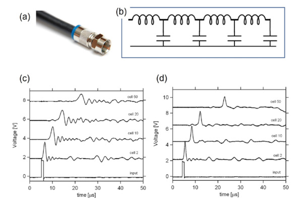 图1: (a) 最简单的电气传输线的例子:同轴电缆;(b) 同轴电缆的离散模型由块状电感和电容的晶格表示;(c) 从晶格的一端发射一个短脉冲,在沿着网络的单元中产生显示的信号模式;(d) 如果电容器被替换成具有相同零电压电容的变容二极管,脉冲就会变成孤子。