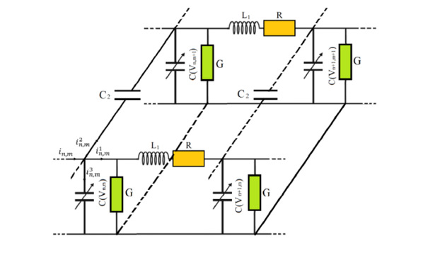图2: 由电阻R、电感L、电容C组成的RLC离散非线性电力传输网络。这是其中一个单元的示意图