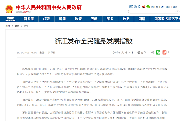 8月5日,中国政府网(中华人民共和国中央人民政府门户网站)转发新华社《浙江发布全民健身发展指数》的文章,宣传报道《2020年浙江省全民健身发展指数报告》(以下简称“报告”)。该指数报告是浙江师范大学体育与健康科学学院李启迪教授承担的浙江省体育局委托项目的重要成果之一,是浙江首次面向社会发布全民健身发展指数,受到新华网、光明网、人民融媒体、中新网、人民政协网、浙江省政府官网、浙江日报等媒体的关注与报道。