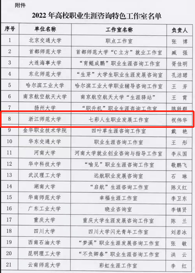 近日,教育部学生服务与素质发展中心公布2022年高校职业生涯咨询特色工作室建设名单,全国共有21所高校工作室入选,浙江师范大学七彩人生职业发展工作室成功立项。