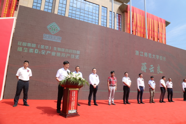 蒋云良代表浙师大对花园集团(金华)生物医药科技园维生素D3全产业链的正式投产和本次签约共建创新药物研究院表示祝贺,并简要介绍了学校的基本情况。蒋云良指出,浙师大在信息技术、智能制造、绿色化工制药等领域形成了服务优势,校企双方本着自愿、平等、互利、共赢的原则共建创新药物研究院,标志着双方的友好合作取得了新进展、迈上了新台阶。蒋云良希望双方进一步加强沟通协商,建立定期交流机制,推进高层次人才双向流动,构建以人才培养为纽带,以项目合作为载体的产学研合作新模式;充分发挥自身科研人才优势,进一步推进花园生物维生素全产业链中新产品、新技术的研发,积极开展企业智能化、数字化新技术联合攻关,为区域经济社会的产业转型升级和可持续发展做出积极贡献。