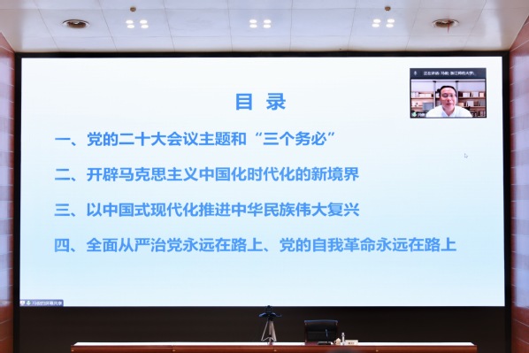 冯俊教授以《牢牢把握新时代中国特色社会主义思想的世界观和方法论》为题,就党的二十大会议主题和“三个务必”、开辟马克思主义中国化时代化的新境界、以中国式现代化推进中华民族伟大复兴、全面从严治党永远在路上和党的自我革命永远在路上等四个篇章进行了讲解。冯俊指出,大会主题的四句话,思想深邃,意义明确,吹响了奋进新征程的进军号,明确宣示了党在新征程上举什么旗、走什么路、以什么样的精神状态、朝着什么样的目标继续前进。党的十八大以来,以习近平同志为核心的党中央从理论和实践结合上系统回答了新时代坚持和发展什么样的中国特色社会主义、怎样坚持和发展中国特色社会主义这个重大时代课题,回答了新时代坚持和发展中国特色社会主义的总目标、总任务、总体布局、战略布局和发展方向、发展方式、发展动力、战略步骤、外部条件、政治保证等基本问题,并且根据新的实践对经济、政治、法治、科技、文化、教育、民生、民族、宗教、社会、生态文明、国家安全、国防和军队、“一国两制 ”和祖国统一、统一战线、外交、党的建设等各方面作出理论分析和政策指导,创立了习近平新时代中国特色社会主义思想。习近平新时代中国特色社会主义思想,是对马克思列宁主义、毛泽东思想、邓小平理论、“三个代表”重要思想、科学发展观的继承和发展,是马克思主义中国化最新成果,是党和人民实践经验和集体智慧的结晶,是中国特色社会主义理论体系的重要组成部分,是全党全国人民为实现中华民族伟大复兴而奋斗的行动指南,必须长期坚持并不断发展。