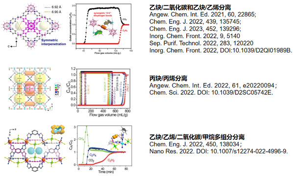另外,课题组在乙炔/二氧化碳分离(Chem. Eng. J. 2022, 439, 135745; Chem. Eng. J. 2023, 452, 139296; Inorg. Chem. Front. 2022, DOI:10.1039/D2QI01989B)、乙炔/乙烯分离(Sep. Purif. Technol. 2022, 283, 120220; Inorg. Chem. Front. 2022, 9, 5140-5147)、乙炔/乙烯/二氧化碳/甲烷多组分分离(Chem. Eng. J. 2022, 450, 138034; Nano Res. 2022. DOI: 10.1007/s12274-022-4996-9)等重要挑战性气体分离领域取得有益进展。发表在Inorg. Chem. Front. 的文章被选为内封面,通讯作者张袁斌博士入选2022年ICF Emerging Investigator(新锐科学家)。