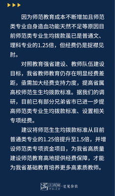建议将师范生生均拨款标准从目前普通类专业的1.25倍提升至1.5倍,并增设师范类专项资金项目,为我省高质量建设师范教育高地提供经费保障,才能为我省基础教育培养更多高素质教师。