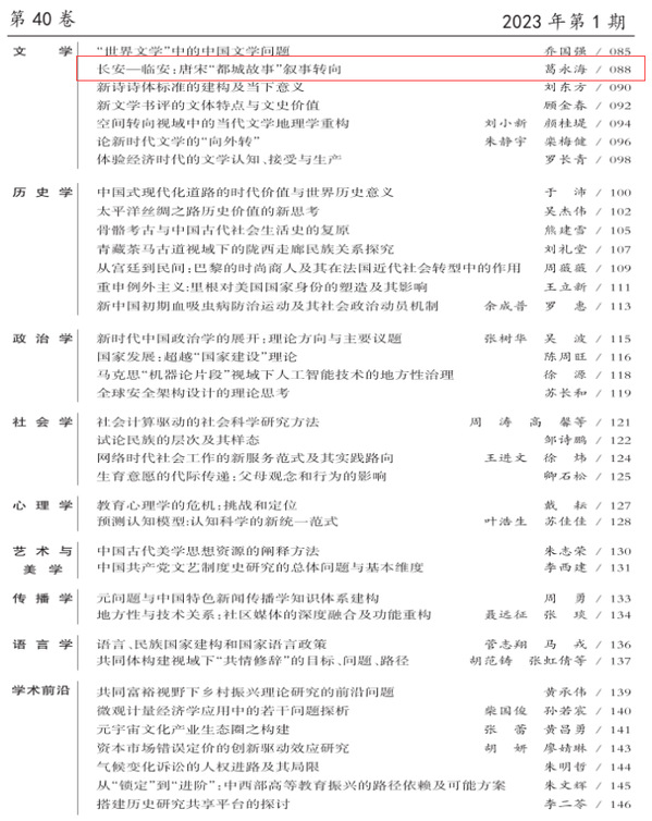 近日,《高等学校文科学术文摘》2023年第1期转载浙江师范大学人文学院葛永海教授署名文章《长安—临安:唐宋“都城故事”叙事转向》。