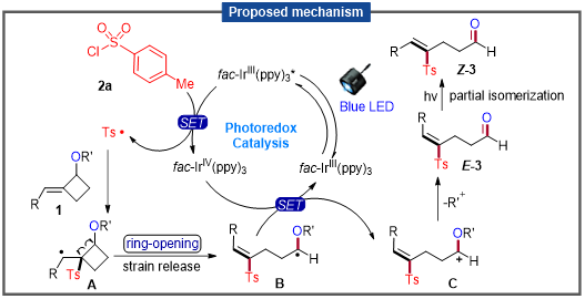 实际上,过去关于环丁醇的C–C键活化已多有报道,但往往是先经过过渡金属介导的电子转移形成环丁氧自由基中间体,然后快速开环形成具有酮羰基的线性烷基自由基。所以从反应机制上来说,本研究的独特之处在于,首先是自由基对于烯基片段的区域选择性加成,接着环丁基片段上发生关键的C–C键均裂,导致原有双键恢复并同时产生热力学更稳定的新自由基。控制实验进一步表明,开环之后得到的E构型产物可以在光催化剂和光照条件下进一步发生一定程度的异构化得到Z型产品。