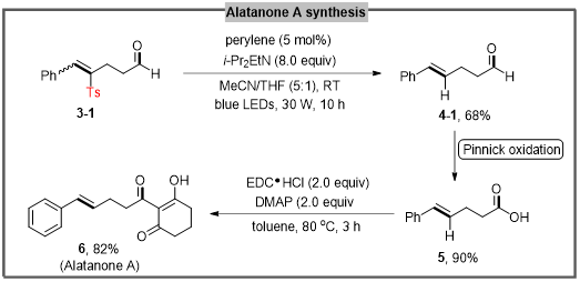 这种反应设计要考虑使用适当地自由基源,为使自由基片段通过简单处理可以移除,而不成为合成目标物的“尾巴”,尤其体现在天然产物和药物分子的合成设计中。课题组将以上合成策略成功应用到了具有良好抗菌活性的天然产物具翅草胡椒酮A(Alatanone A)的全合成中。利用我们发展的选择性开环方法作为最关键的第一步得到产品3-1,再经过三步转化可以获得目标分子。