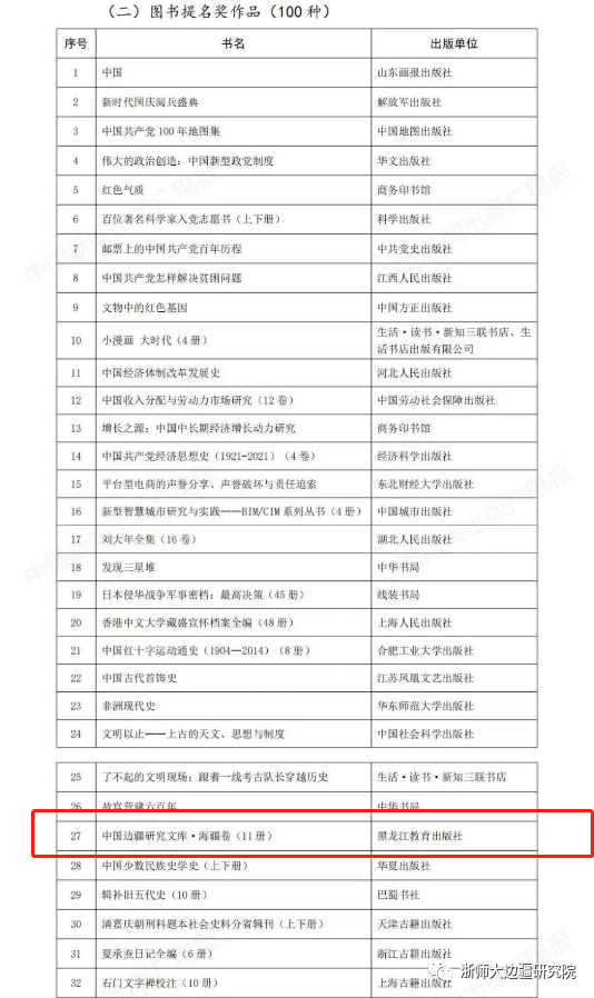 2月27日,根据中央宣传部文件批复精神,由中国出版协会举办的第八届中华优秀出版物奖公示获奖名单。浙江师范大学边疆研究院于逢春教授主编的学术研究丛书《中国边疆研究文库·海疆卷》(11册)经评审入选“第八届中华优秀出版物奖图书提名奖”。