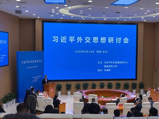 3月18日,“习近平外交思想研讨会”在长沙召开,会议主题为“以习近平外交思想为指引,推动构建人类命运共同体”,由习近平外交思想研究中心和湖南师范大学联合举办。