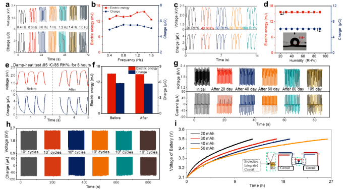 图1 a,b AC-DEG的频率适用性; c,d 湿度稳定性; e,f 双85老化测试前后性能; g在常规环境条件下100天的稳定性; h 连续循环运行100万次性能变化; i 为商用锂离子聚合物电池充电