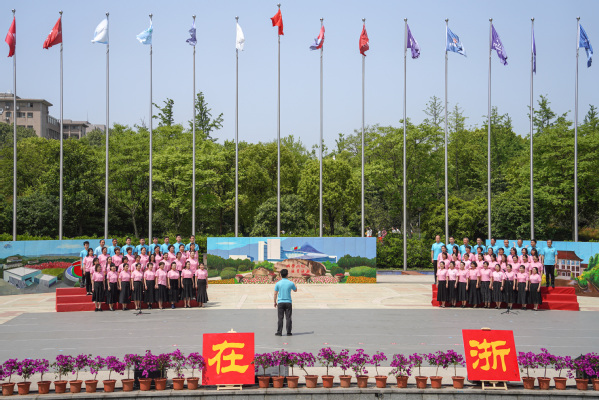 “我把青春融进祖国的江河……”师生合唱团带来歌曲《祖国不会忘记》《浙江师范大学校歌》,歌颂着新中国日新月异的图景,唱出了浙师人踔厉奋发的昂扬斗志。