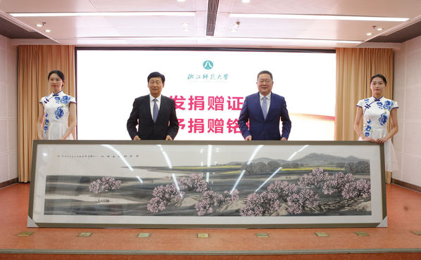 浙师大党委书记郑孟状代表学校向姚恒国赠送著名画家赵溅球教授画作《桃李芬芳香天下》。浙师大融媒体中心 吴伟琪 摄
