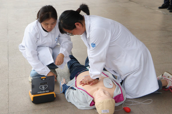 校医院医护人员演示学生因吸入大量浓烟窒息昏迷的急救操作,在场人员学习心肺复苏步骤和AED的使用操作。
