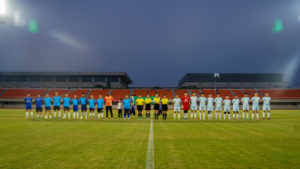 晚风伴随着斜阳,照明灯点亮了赛场。运动员和裁判员们在曲声中步入绿茵场。入场完毕后,现场奏响了中华人民共和国国歌,在场人员全体起立,面向国旗奏唱国歌。