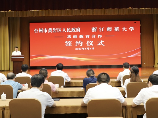 6月8日,浙师大与黄岩区举行合作办学签约仪式,共同见证浙江师范大学附属黄岩实验学校的办学启动。台州市黄岩区区委书记包顺富,浙师大副校长林一钢出席签约仪式。