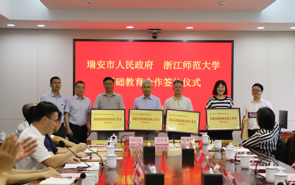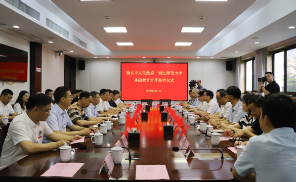 6月12日,浙师大与温州瑞安市举行基础教育合作签约仪式,见证浙江师范大学附属瑞安高级中学、浙江师范大学附属瑞安初级中学两所附属学校的办学启动,并参与两所附属学校特级(正高)教师名师工作室的挂牌。瑞安市副市长麻素挺,浙师大副校长张根福出席签约仪式。