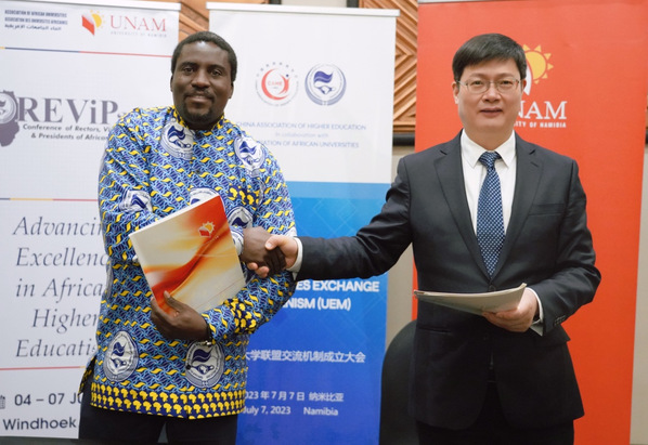 7月7日,中非大学联盟交流机制成立大会在纳米比亚首都温得和克举行。中国高等教育学会副会长、哈尔滨工业大学原校长周玉,非洲大学协会主席赛义德•奥斯曼,非洲大学协会秘书长奥卢索拉•奥耶活勒,中国驻纳米比亚大使赵卫平,中非大学联盟交流机制中方执行副主任、浙江师范大学校长蒋云良,非洲大学校长论坛参会大学校长代表以及中国高等教育学会代表团成员等参加成立大会。