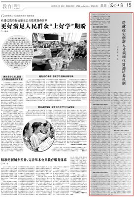 8月29日,《光明日报》刊发教育学院殷玉新副教授和研究生署名文章《造就拔尖创新人才须细化贯通培养机制》。文章认为,贯彻落实党的二十大精神,亟须建构中国特色的大中小学一体化拔尖创新人才培养模式,建立学段贯通的衔接机制,布局学校差异化发展态势,探索学科融合的建构思路,建构学生个性化成长路径,为实现教育强国战略提供高质量人才队伍。