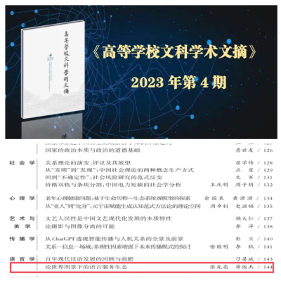 近日,浙江师范大学语言生态研究院张先亮教授和博士生席俊杰的署名文章《论世界图景下的语言服务生态》被《中国社会科学文摘》《高等学校文科学术文摘》转载,该文15000余字,发表在《当代修辞学》上。 《中国社会科学文摘》《新华文摘》《高等学校文科学术文摘》是我国人文社会科学领域“三大权威文摘”。至此,该文已被两大权威文摘转载。