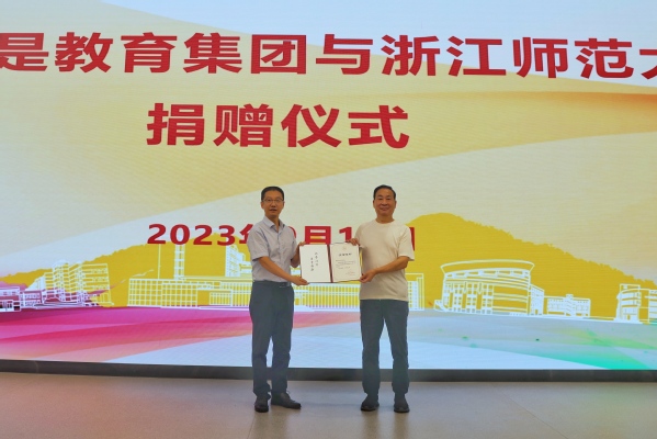 毛伟民、张建珍共同签署民盟浙江省委会、浙江师范大学合作共建高质量教育体系研究中心战略合作协议书。湖州求是教育集团捐资50万元用于研究中心的建设。会上,浙师大教育基金会相关负责人为沈法初颁发捐赠证书。