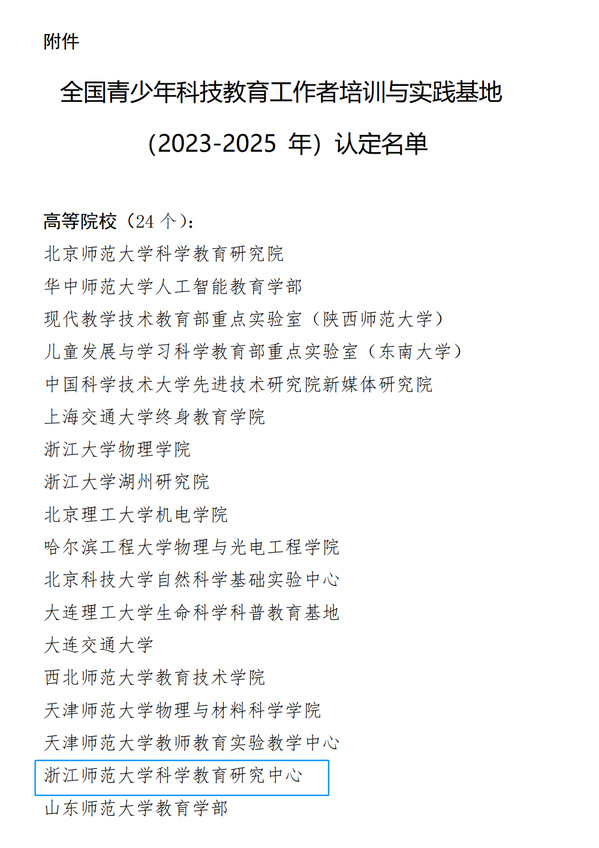 近日,经过初评、终评和公示,中国青少年科技教育工作者协会认定63个单位作为全国青少年科技教育工作者培训与实践基地(2023-2025年)。其中,浙师大科学教育研究中心成功认定。