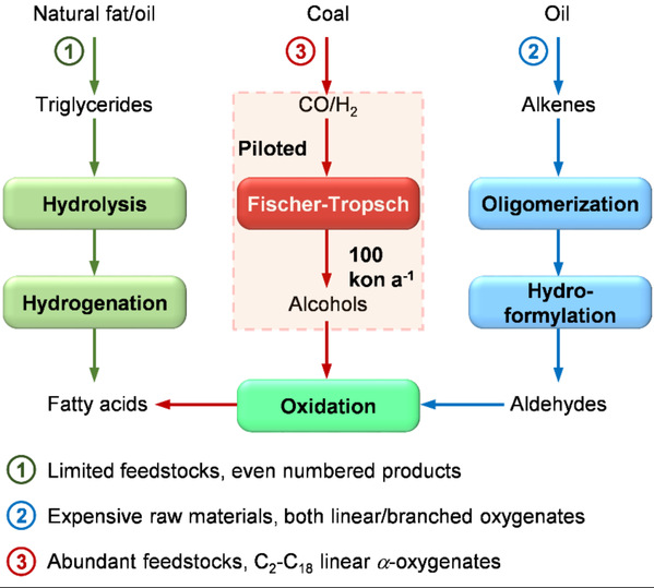 高级脂肪酸是一类重要的平台化合物,在食品、医药和化学化工领域用途广泛。当前高级脂肪酸多从动植物油脂中提取,且天然脂肪酸碳数通常为偶数,稀缺的原料来源和单一的碳数结构限制了其应用。先前丁云杰团队通过Co-Co2/C改性费托合成催化剂的创制,成功实现合成气一步法转化为C2-C18直链高碳醇,并于2019年在陕西榆林完成世界首例万吨级工业中试。通过耦合费托合成与脂肪醇氧化,开发煤炭经合成气、混合醇、再到高级脂肪酸的新工艺,不仅能够解决原料稀缺问题,而且可以获得奇数碳的脂肪酸,极大拓展其应用,因而具有重要的意义。