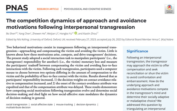 近期,浙江师范大学心理学院周晓林教授和李伟健教授团队在国际期刊Proceedings of the National Academy of Sciences (JCR Q1; 中科院一区) 在线发表了题为The competition dynamics of approach and avoidance motivations following interpersonal transgression的学术论文。本研究揭示了人际伤害之后施害者关于趋向和回避两种动机的时间竞争过程。