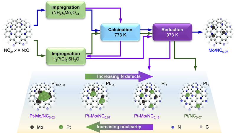 在前期工作中,林荣和所在精细化工与碳催化课题组以苯胺等含氮有机小分子的聚合作为切入点,在新型氮碳材料的缺陷调控方向展开系统性工作,发展了一系列通过调节高分子聚合度(ACS Catal., 2018, 8, 1114)、交联高分子的选择性开环 (Adv. Funct. Mater., 2021,31, 2006076)、以及模板剂分子掺杂(Carbon, 2022, 196, 110)等调变氮缺陷数量和分布的方法。在此基础上,提出通过热驱动金属物种在载体表面迁移和缺陷捕获法,成功实现Au (Angew. Chem. Int. Ed., 2019, 58, 504;Angew. Chem. Int. Ed. 2022, 61, e202214166)、Pt (Nanoscale, 2022, 14, 10506)、Ir (J. Energ. Chem., 2022, 69, 541)等单金属原子配位环境和成核、以及Pt-Bi双金属空间分布的调控(ACS Catal. 2023, 13, 12571)。本工作中,研究者进一步提出结合顺序浸渍法和载体缺陷工程的创新性策略,即在首次浸渍过程中利用sp2杂化的氮缺陷位先牢牢锚定Mo原子,然后在二次浸渍中引入Pt前驱体,并通过减少氮缺陷数量控制Mo邻近位点Pt原子的成核,进而获得一系列从单原子到亚纳米尺度的低核双金属团簇。研究表明,具有Pt3Mo1N3结构的团簇在甲酸气相分解制氢反应中表现出远超当前已报道同类催化剂的优异活性(373K下转换频率达0.62 molHCOOH molPt−1 s−1)和稳定性。结合双光束原位红外光谱、动力学和理论计算研究发现,具有四面体构型的Pt3Mo1N3团簇在甲酸分子活化过程中存在Pt-Mo间协同效应,能够为甲酸连续氢解离创造能量更低的反应路径。上述研究成果为开发高效甲酸分解制氢催化剂和设计多金属低核纳米材料提供了丰富的启示。
