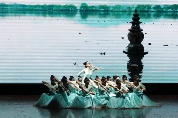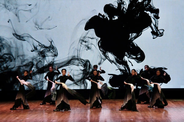 碧裙白伞,叮铃雨声。儿童教育学院的舞者带来《雨涧春行图》,一袭袭青绿长裙,一把把油纸伞,将万千柔情的西湖晴雨带到现场。遒似山岳,柔如流水。外语学院的舞蹈《水墨》,以半分黑白的色调对比,为我们展现了刚柔并济的笔墨走势。
