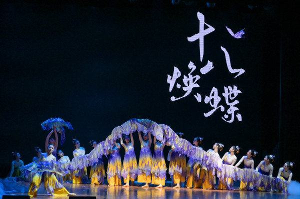 春水碧于天,画船听雨眠。空灵背景音的吟唱,和上中国传统的管弦乐器,人文学院的舞蹈《能不忆江南》为观众带来了中国舞的柔情风韵。翩跹起舞,生命更替。行知学院的姑娘们在轻纱彩扇的挥舞中旋转跳跃,为观众带来如精灵般曼妙的《十八焕蝶》。