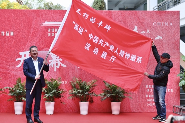 郑孟状为画说中国共产党人精神谱系流动展厅和红色宣讲团授旗,并宣布开幕。