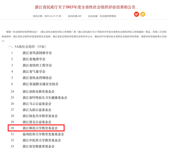 12月13日,浙江省民政厅发布了关于2023年度全省性社会组织评估结果的通报,浙师大教育基金会再次获评5A级社会组织。