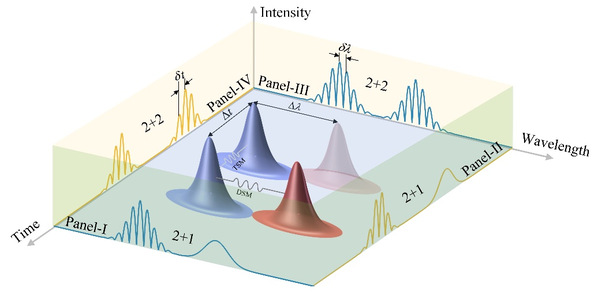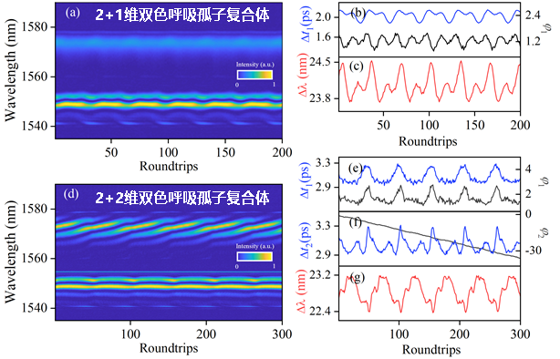 产生双色孤子复合体的实验装置是一种基于交叉相位调制效应的被动同步多波长锁模光纤激光器,利用超快时域拉伸测量技术,实现了多维双色孤子复合体频域呼吸动力学的实时观测。研究发现,双色孤子复合体同样具有类似于粒子的特性,通过相互之间的吸引与排斥,可以形成时间维度和频率维度上均具有双孤子结构的孤子复合体。这种在两种维度上的孤子复合体包含更为复杂的动力学特性,兼具孤子分子时域上的束缚态特性以及呼吸孤子的振动动力学特性。在实验中,通过增加泵浦功率,可以观察到2+1和2+2型双色孤子复合体的时间和频率间隔的呼吸动力学的产生。同时,这种固有的非线性特性在振动动力学上产生了倍频跃迁。最后,通过耦合非线性薛定谔方程描述的激光模型,数值模拟也证实了该实验现象。