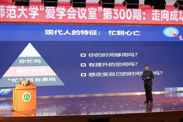 3月13日,浙江师范大学“爱学会议室”第300期活动“走向成功——从时间管理开始”专题讲座在大学生活动中心二楼报告厅举行。浙江师范大学副校长(主持行政工作)、党委副书记邱利民作为主讲嘉宾开讲。