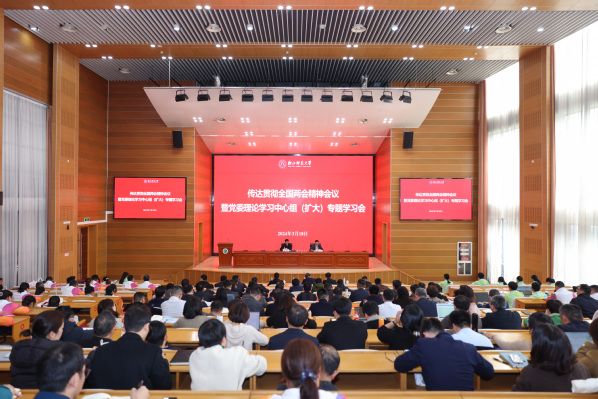 蒋云良强调,对标省委部署,我们要迅速掀起学习贯彻全国两会精神热潮,凝心聚力推进高水平大学建设。一是深入学习领会,坚决把思想和行动统一到习近平总书记重要讲话和全国两会精神上来。学习好、宣传好、贯彻好全国两会精神是当前首要的政治任务。要站在政治和全局的高度,认真抓好全国两会精神的学习宣传贯彻,要突出重点学、全员覆盖学、创新形式学,不断增强贯彻落实的自觉性和坚定性,确保总书记重要讲话精神和全国两会精神在师生心中落地生根。二是狠抓贯彻落实,全力推动全国两会精神在浙师落地见效。要把学习贯彻全国两会精神与党的二十大精神、习近平总书记考察浙江重要讲话精神和对浙师大建校50周年贺信精神结合起来,与当前全校上下正在开展的中心工作有效衔接、融会贯通,高质量召开学校第七次党代会,以时不我待的紧迫感、不进则退的危机感、狠抓落实的责任感,奋力推动各项决策部署在浙师落实落地、见行见效,以浙师一校之发展为全省大局多作贡献。三是聚焦提质提速,奋力推动高水平大学建设跃上新台阶。锚定高水平大学建设目标,我们要深入学习领会习近平总书记关于发展新质生产力的重要论述精神,扎实做好教育改革、科技创新、人才培养工作,全面提升人才培养质量、全面推动科技创新发展、全面深化开放办学格局,为推动新质生产力加快发展贡献新时代高等教育力量。