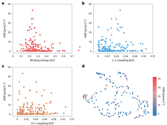 最后,作者基于高通量实验获得的大量数据,使用理论计算的方法研究了影响光催化制氢性能的可能因素。有趣的是,作者发现当以给体和受体分子之间的binding energy(Eb)为横坐标,以光催化制氢量为纵坐标时,可以获得一条形似火山型的曲线(图6)。具有高催化活性的分子纳米结组合的Eb 都位于0.15–0.25 eV之间,表明Eb可能是分子纳米结光催化制氢的一个潜在“描述符”。
