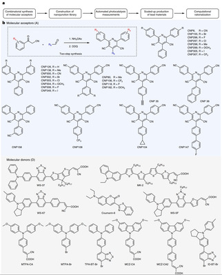 图1,分子纳米结光催化剂的发现流程(a)以及组合分子库的合成(b)。