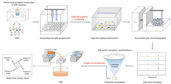 有机半导体异质结由于良好的电荷分离在光-电/化学转换领域受到了广泛关注。然而由于多组分的存在,异质结半导体的发现和优化过程却是十分复杂而费力,尤其是考虑到半导体材料的性质不仅与其化学结构相关,而且受到形成微观结构的影响。高通量自动化实验可以在一定程度上可以加快材料的发现速度,但是其筛选规模往往较小,筛选的实验结果在转移到宏量制备时存在明显挑战。