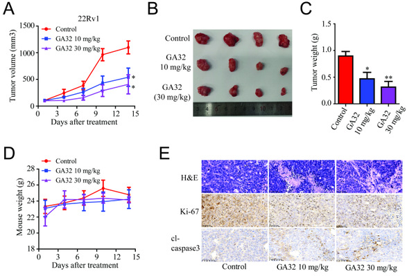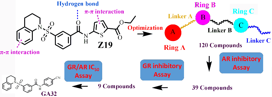 近年研究表明,糖皮质激素受体(GR)过表达是AR拮抗剂恩杂鲁胺产生耐药的一个新机制,而GR拮抗剂可恢复CRPC细胞对恩杂鲁胺的敏感性。因此,同时阻断AR、GR信号通路有望解决GR过表达引起的CRPC耐药问题。作者前期研究表明化合物Z19能有效抑制AR(IC50=2.03 μM)和 GR(IC50=2.50 μM)的转录活性,以及抑制22Rv1细胞(对恩杂鲁胺耐药,同时表达AR和GR是一个AR/GR双靶分子)增殖,但其活性比较弱,因此,作者对Z19结构进行系统优化,获得了活性显著提升的化合物GA32,其对AR、GR的转录抑制活性分别为IC50=0.13 μM,0.83 μM,在体外和体内均能有效抑制耐恩杂鲁胺的CRPC增殖。