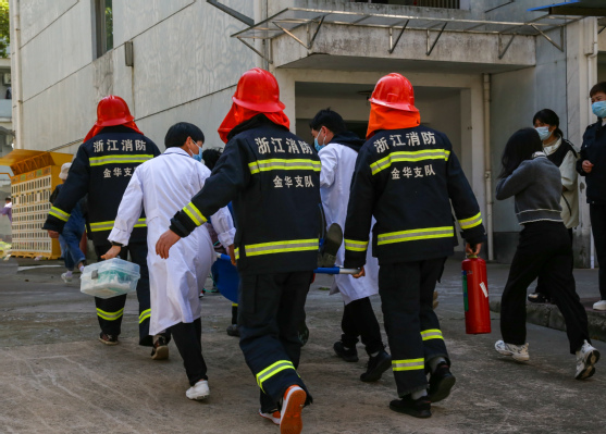 金华消防特勤中队消防战士,浙师大学生处、研工部、保卫处、后勤服务中心负责人和各学院师生代表参加了本次演练。
