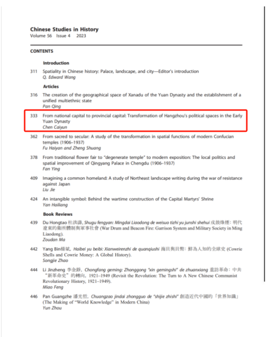 近日,A&HCI来源期刊Chinese Studies in History《中国历史研究》)第56卷第4期发表了浙江师范大学人文学院、江南文化研究中心陈彩云教授的From national capital to provincial capital: Transformation of Hangzhou’s political spaces in the Early Yuan Dynasty一文,从新的角度讨论元初杭州政治空间改造与江南统治问题。