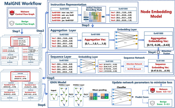 本文在恶意软件智能检测方向,提出了一种名为MalGNE的控制流程图节点表征方法,通过将节点指令序列映射至低维连续空间以提高基于控制流程图的恶意软件检测器的检测精确度和效率。该方法引入了一种新颖的指令编码规则来解决OOV问题,生成高质量的初始向量。同时,采用聚合层和序列层来提取节点聚合特征和执行序列特征,并结合GNN预训练节点嵌入模型,将节点汇编指令序列的语义信息映射到一个紧凑的、低维的连续空间中,确保高质量的特征提取,提高了检测器的性能和效率。该研究应用于当前3个主流图神经网络模型和3个业界公认恶意软件样本集,均展现出较好的增强效果。结果表明,MalGNE增强后的检测器,在低维空间能够展现出色的性能和效率。