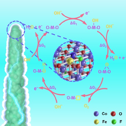 通过简单的阴、阳离子双掺杂策略制备了FeF共掺杂的粗糙CoO纳米针阵列(缩写为FeF-CoO NNAs)用于碱性条件下的电催化析氧反应。得益于晶格氧活化和局域电场的耦合作用,所制备的FeF-CoO NNAs10 mA cm–2的电流密度下表现出169 mV的极低过电位,在500 mA cm–2的工业电流密度下表现出277 mV的过电位和优异的耐久性,超过了大多数已报导的OER催化剂。进一步结合实验结果和理论模拟发现FeF双掺杂可协同调节CoO的电子结构,改善金属-氧共价性和促进晶格氧活化,激活晶格氧活化机制。此外,Fe掺杂增强尖端电场和邻近效应,在催化剂表面高效富集OH,提高了传质动力学,优化了晶格氧活化机制反应能垒,促进了O2的解吸。这些结果为设计高效的OER电催化剂开辟了一条新途径,也加深了对催化剂构效关系和电催化机理的理解。更广泛地说,这项工作对其他催化反应以及涉及氧化学或传质的能量存储系统的研究具有重要借鉴意义。